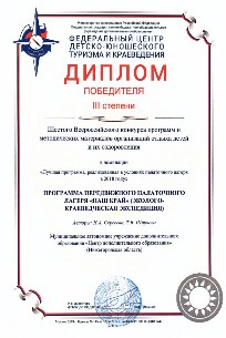 3 место - Шестого Всероссийского конкурса программ и методических материалов организаций отдыха детей и их оздоровления в номинации "Лучшая программа, реализованная в условиях палаточного лагеря", 2019 год
